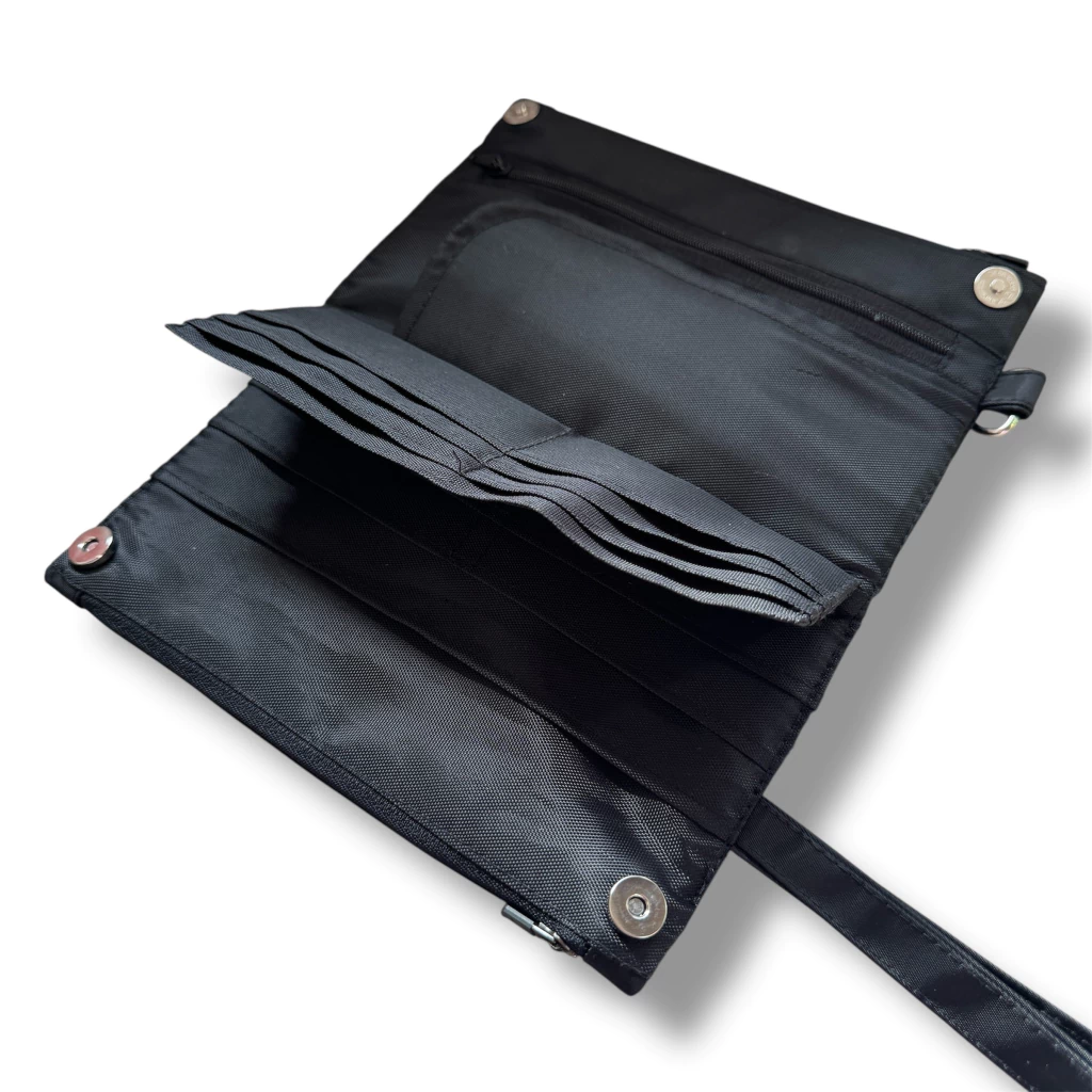 Su apertura es con dos broches imán y su interior es de lona resistente y lavable en color negro. Posee espacio para 16 tarjetas y un compartimento del ancho de la billetera para papeles. Del otro lado, solapa para billetes y bolsillo con cierre interno.
