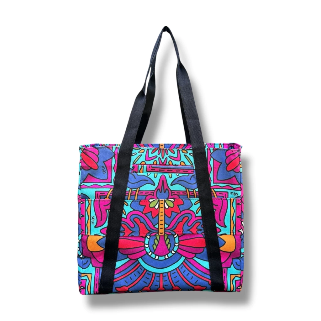 Fabricado en lona estampada con nuestras ilustraciones exclusivas. Su apertura es con cierre y tiene dos manijas de reforzadas.